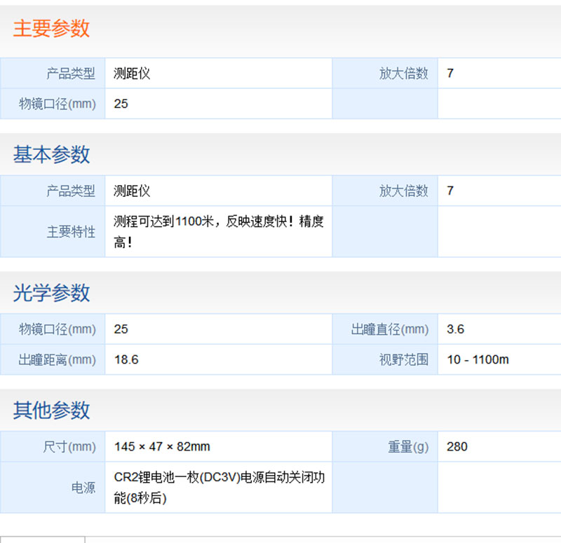 望远镜放大率7X,有效孔径25mm,视场5.0°。尼康NIKON锐豪1200S测距望远镜量测精度±0.5m,量测范围10-1100米/11-1200码。测程可达到1100米,反映速度快!精度高!