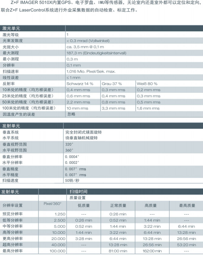 Z+F 5010X基于Z+F IMAGER®5010C增加配备了独特的室内导航系统(包括内置陀螺仪,惯导,电子罗盘,气压计,加速度传感器)和GPS,可估算扫描仪的方位,以支持在实地瞬间自动拼接,自动同步所有扫描数据。Z+F LaserControl®Scout和Z+F IMAGER®5010X相结合,开启了以Blue Workflow工作流程实施现场自动拼接的激光扫描的革命!有效地提高了工作效率。